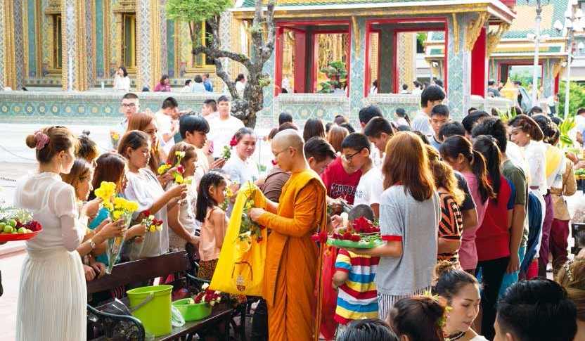 ภาพตักบาตรดอกไม้ในวันเข้าพรรษาวัดราบพิธสถิตมหาสีมารามกรุงเทพมหานคร