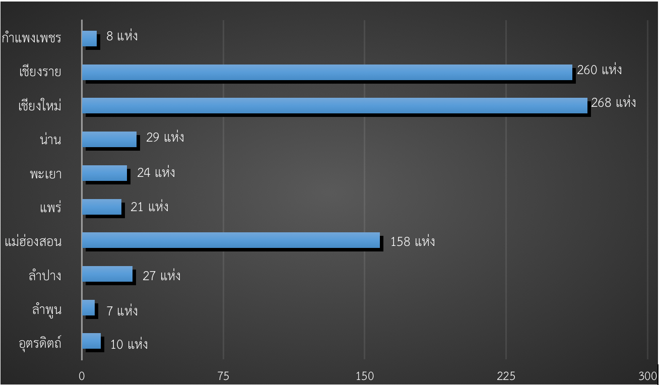1. ภาคเหนือ มีคริสตจักรรวมทั้งสิ้นจำนวน 812 แห่ง แบ่งเป็นจังหวัดต่างๆ ได้แก่ กำแพงเพชร จำนวน 8 แห่ง เชียงรายจำนวน 260 แห่ง เชียงใหม่ จำนวน 268 แห่ง น่าน จำนวน 29 แห่ง พะเยา จำนวน 24 แห่ง แพร่ จำนวน 21 แห่ง แม่ฮ่องสอน จำนวน 158 แห่ง ลำปาง จำนวน 27 แห่ง ลำพูน จำนวน 7 แห่ง และอุตรดิตถ์ จำนวน 10 แห่ง ดังแผนภูมิที่ 2