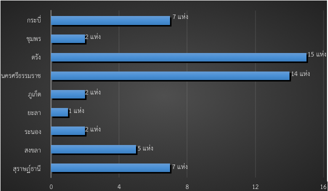 6. ภาคใต้ มีคริสตจักรรวมทั้งสิ้นจำนวน 55 แห่ง แบ่งเป็นจังหวัดต่างๆ ได้แก่ กระบี่ จำนวน 7 แห่ง ชุมพร จำนวน 2 แห่ง ตรัง จำนวน 15 แห่ง นครสีธรรมราช จำนวน 14 แห่ง ภูเก็ต จำนวน 2 แห่ง ยะลา จำนวน 1 แห่ง ระนอง จำนวน 2 แห่ง สงขลา จำนวน 5 แห่ง และสุราษฏร์ธานี จำนวน 7 แห่ง ดังแผนภูมิที่ 7